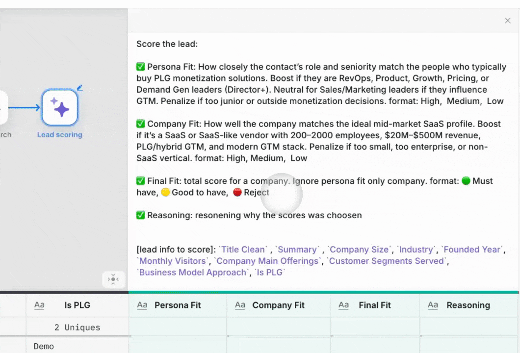 Use AI to extract insights from websites or search results, or generate custom fields like summaries, angles, and icebreakers.