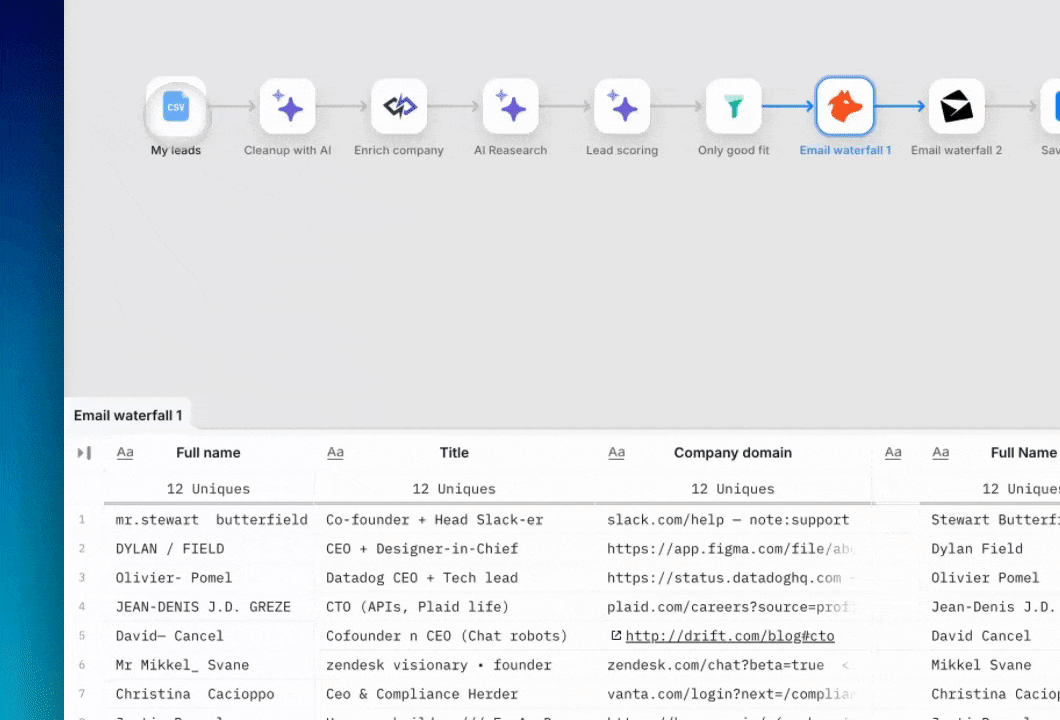 Enrich your data using multiple providers at once, combining firmographics, emails, social links, tech stack, and funding data in a single flow.